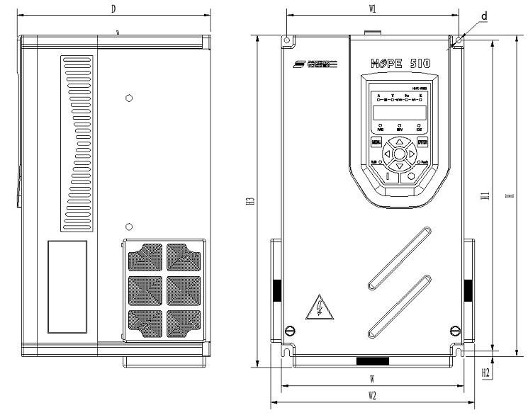 变频器型号 | W (mm) | W1 (mm) | W2 (mm) | H (mm) | H1 (mm) | H2 (mm) | H3 (mm) | D (mm) | d (mm) |