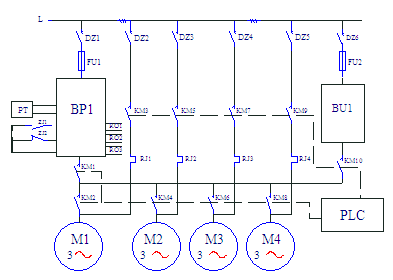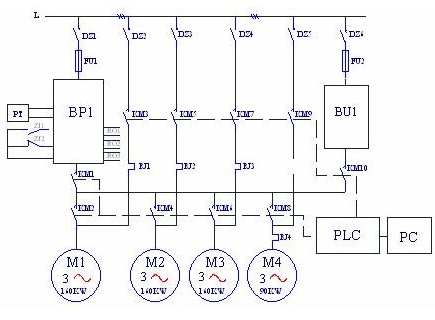 图中:BP1—变频器;BU2~BU4--软起动器,PT—压力变送器。由图一可见,变频器连接在第一台水泵电机上,需要加泵或减泵时,由变频器RO1~RO3端口输出信号起动或停止其他的水泵,这时水泵的起动采用自耦降压起动装置或软起动器。这种方案的特点是水泵电机不需要在变频和工频之间切换;第一台水泵永远连接在变频器上,没有切换过程中的失压现象;由于变频泵以外的泵都有软起动器,所以不需要再做备用系统,当变频器故障时,可用软起动器手动起动M2~M4水泵,保证供水不致中断;每台电机都有起动器,初始投资较大。另一种是“循环投切”方案,系统图如图二所示