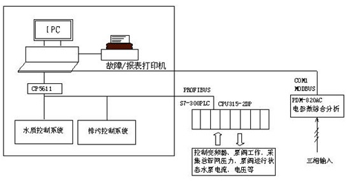 为保证系统的可靠性,上位机PC用于管理,用组态软件做出若干工艺流程图,实时显示系统的运行状况,并统计历史数据,如需要可随时打印报表;还用于故障的报警和处理。PC机为研华工业计算机,PLC为西门子S-7300,便于与总控室计算机联网,采用带有PROFIBUS接口的CPU315。CP5611是通信模块,PDM-820AC电参数综合分析仪用于检测系统的用电量。控制水泵的起/停,切换,阀的启/闭;电机电流,温度的检测,水泵使用时间的统计;压力,流量,水质参数的采集等,均由PLC完成。水压的给定值由变频器键盘设定。